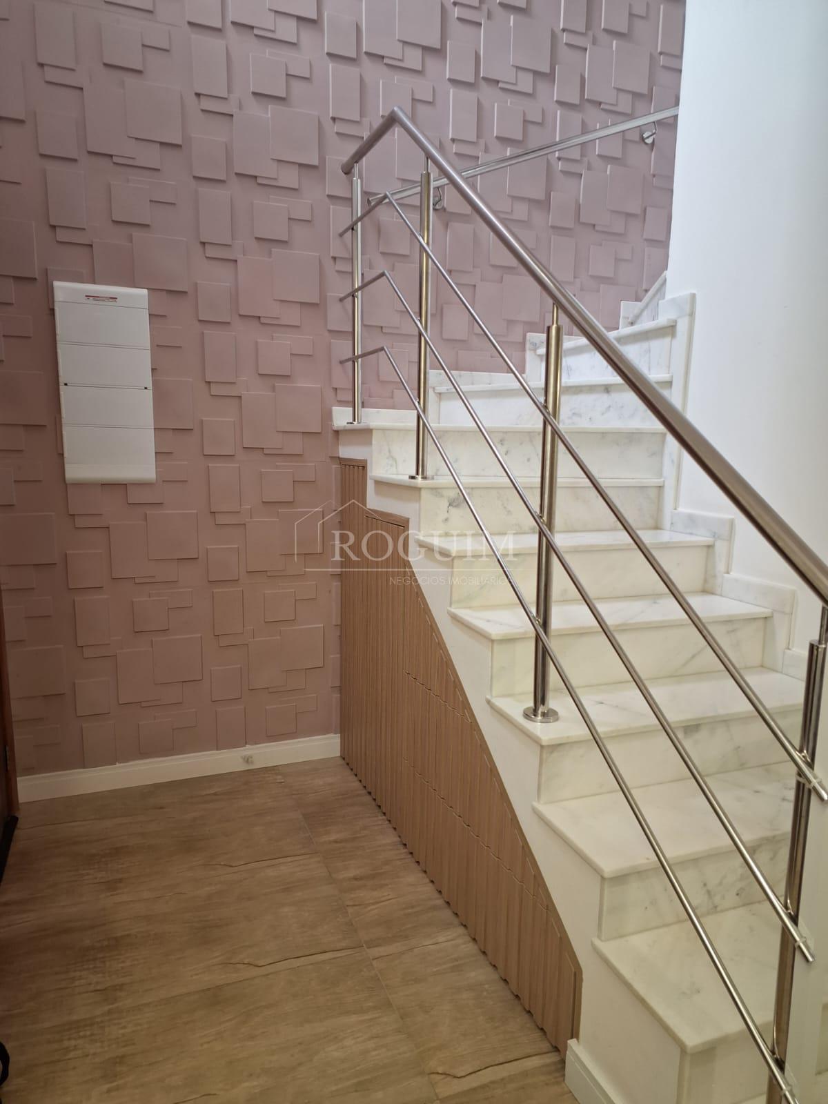 - Escada com acabamento em pedra, corrimão em inox e armário embutido debaixo da escada.
